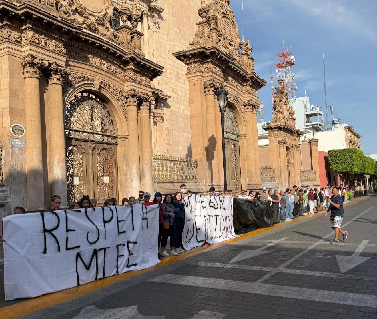 Desde aproximadamente las 14:00 horas, los participantes comenzaron a concentrarse en el perímetro del templo ubicado en la Plaza Principal del Centro Histórico. Con un mecate amarillo se unieron entre sí mientras portaban mantas con mensajes como “Ten respeto por mi fe”.