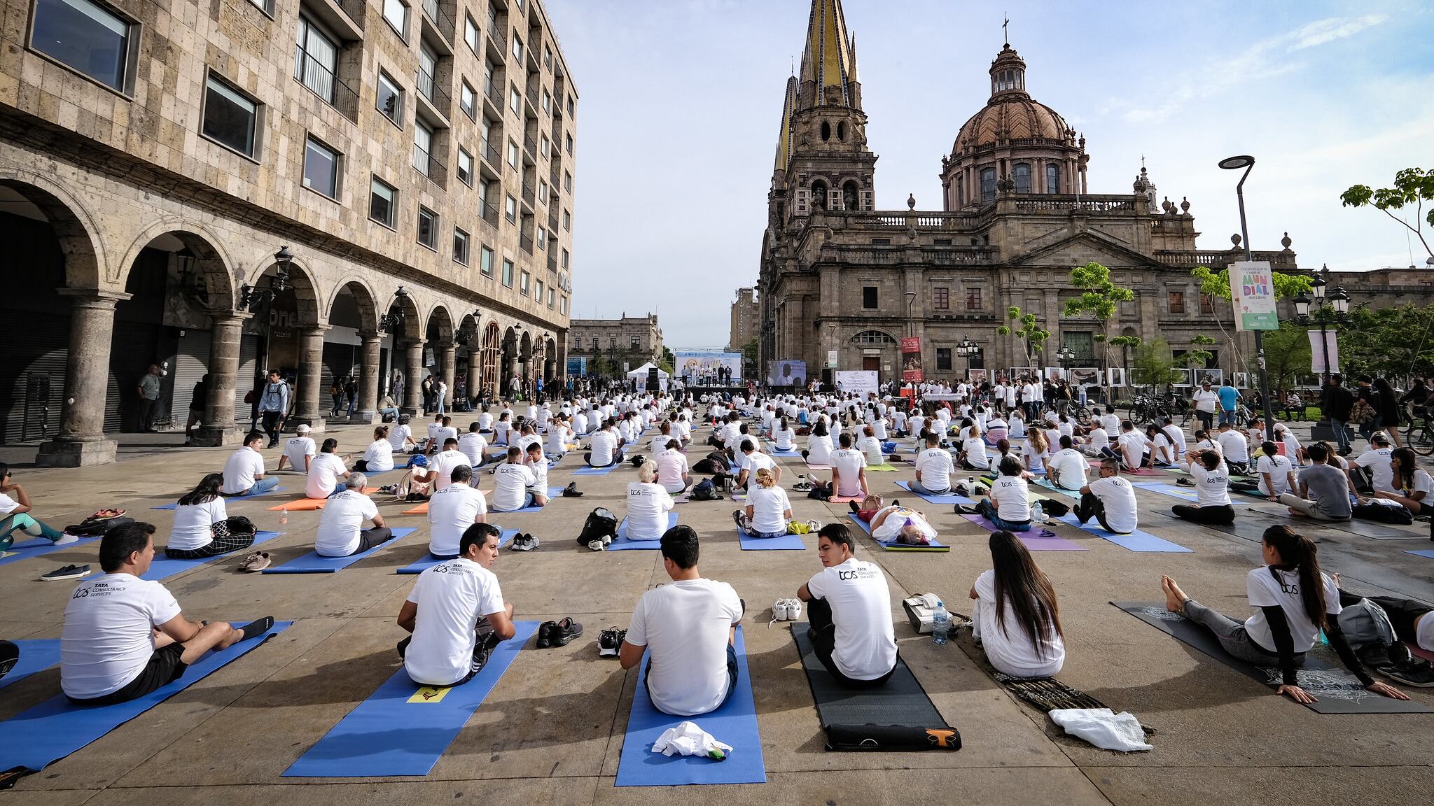 Casi 600 personas se reunieron esta mañana en el Paseo Alcalde para celebrar el Día Internacional del Yoga con una macro clase organizada por el Consejo Estatal de Deporte (CODE) Jalisco.