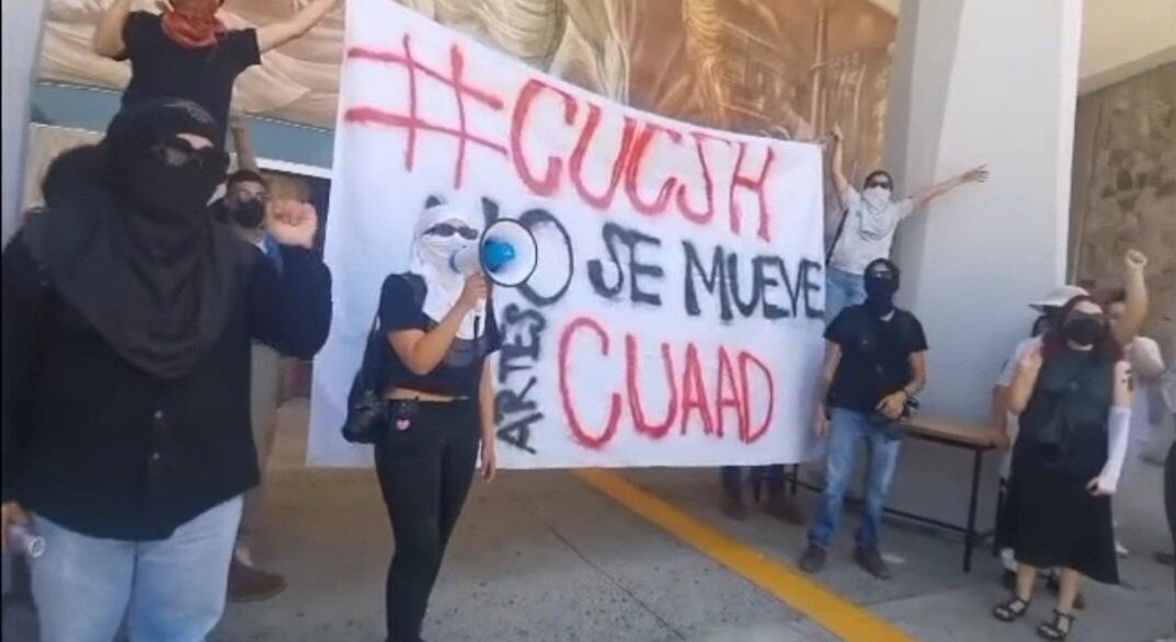 Señalan que es un grupo de alrededor de 30 jóvenes encapuchados quienes se hicieron presentes en las instalaciones del CUCSH La Normal para manifestar su inconformidad por el traslado de las últimas carreras que restan por mudarse de la sede La Normal a Belenes, correspondientes a las licenciaturas de Filosofía, Letras Hispánicas, Historia, Antropología, Geografía, Enseñanza del Inglés como Segunda Lengua y Didáctica del Francés como Segunda Lengua.