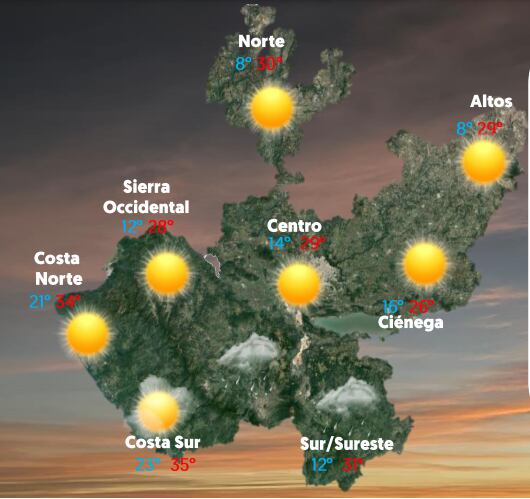 Se mantendrá el ambiente caluroso sobre el estado, por lo que se esperan temperaturas máximas que podrían alcanzar o superar los 35°C en algunas regiones de Jalisco, mientras que en la noche y el amanecer el ambiente estará fresco con temperaturas mínimas que oscilarán entre los 13°C y 15°C y en partes altas de 0°C a 5° con posibles heladas.
