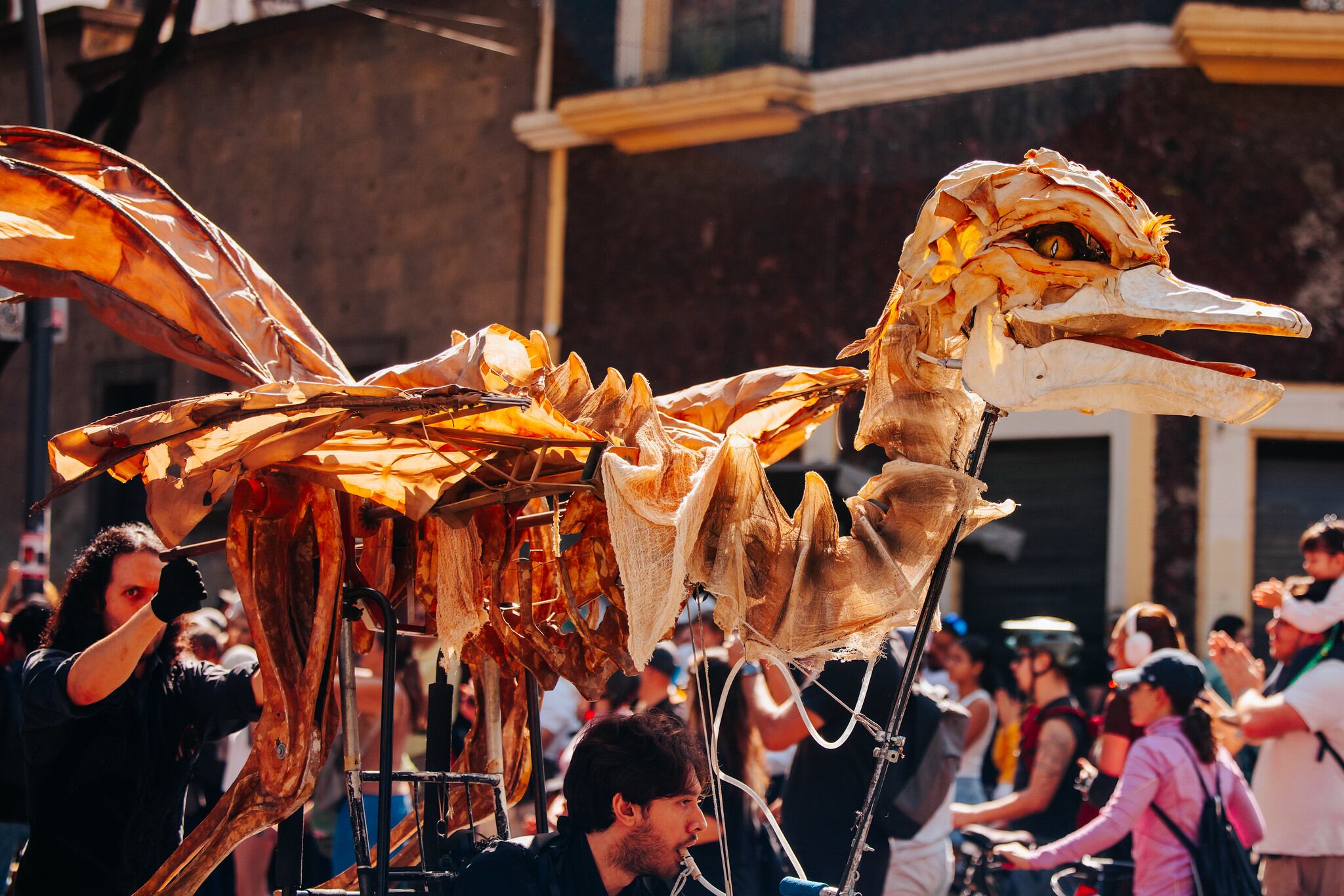 De la misma manera, las marionetas gigantes y las peculiares “alimañas” de utilería convirtieron la Vía RecreActiva en un espacio de juego y participación. Cabe señalar que muchas familias se unieron con sus propios títeres, elaborados previamente en talleres gratuitos organizados dentro del festival.