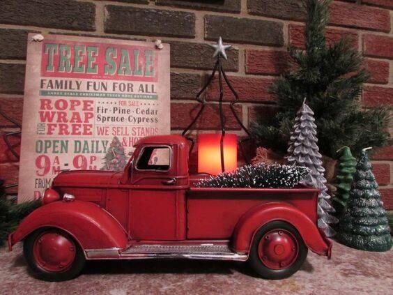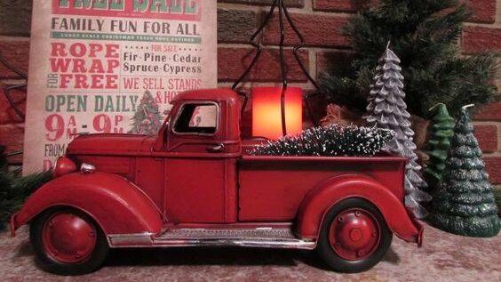 Un camión rojo vintage cargando un árbol está presente en adornos, juguetes, almohadas y todo tipo de artículos.