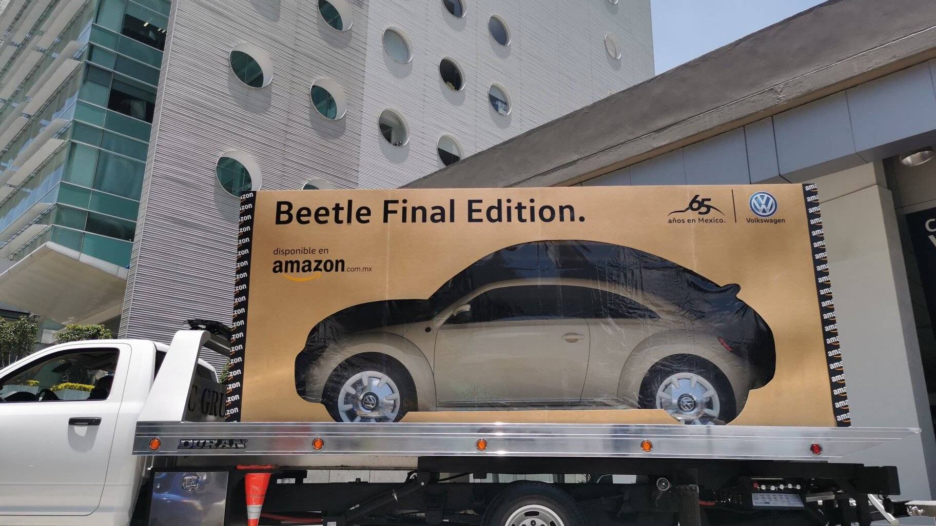 La tienda más grande de comercio en línea se quedó con las últimas 65 unidades del Beetle Final Edition, a fin de promoverlas en su plataforma y asegurarlas a sus clientes a través de un proceso de compra revolucionario. El vehículo fue entregado en plataforma y envuelto con los logos de Amazon, tal como si el producto hubiese sido cualquier otro.