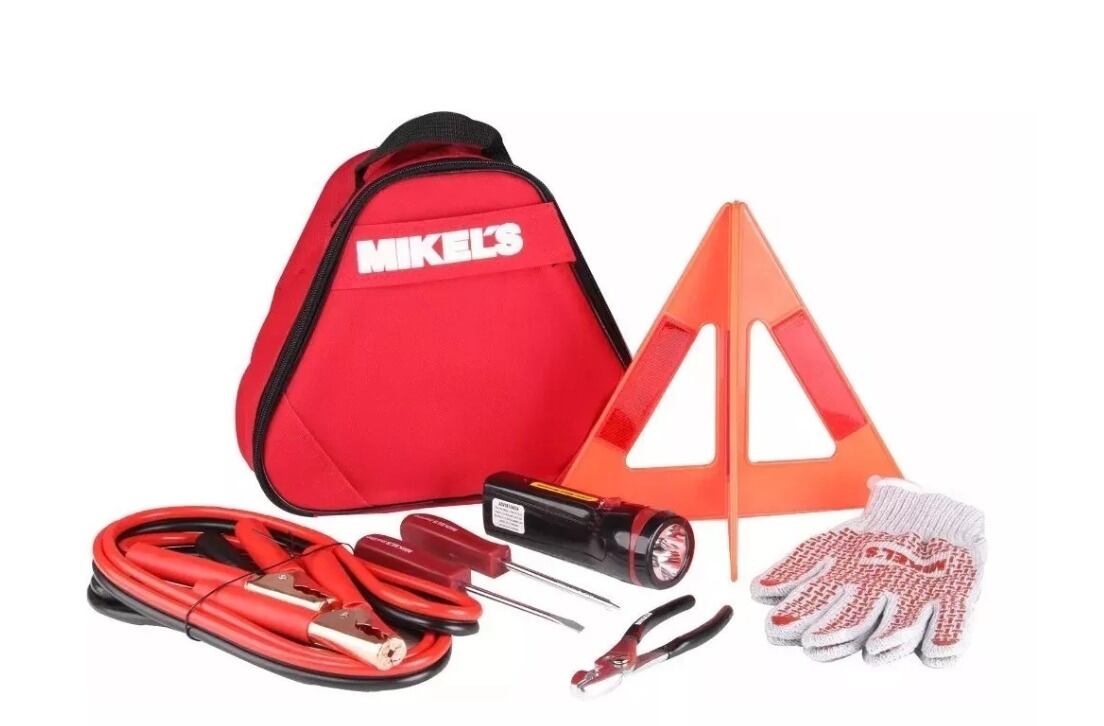 Un kit de emergencia generalmente incluye: triángulo reflejante, desarmador plano, desarmador de cruz, pinza de mecánico, cables pasacorriente, lámpara manual recargable, guantes de algodón con puntos de PVC, entre otros.