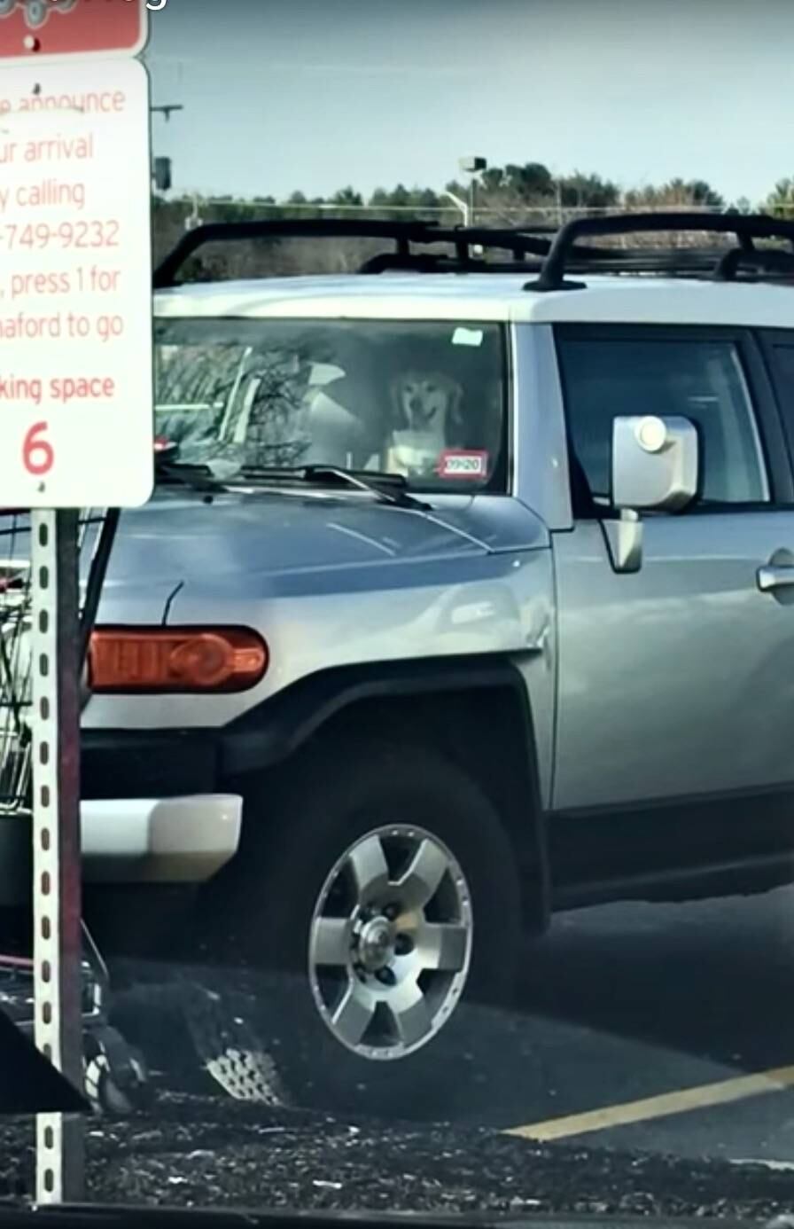 Una familia que esperaba en el vehículo de enfrente filmó el momento en el que el cachorro toca el claxon continuamente para presionar a sus dueños.