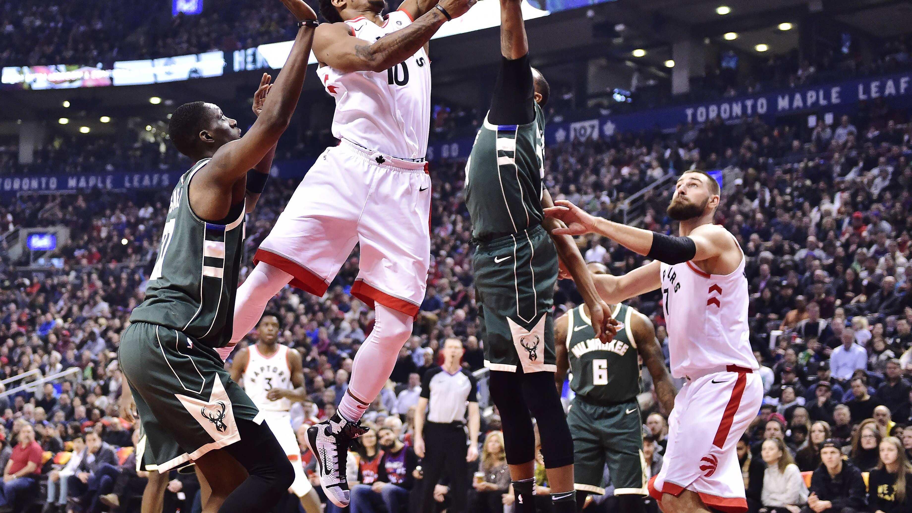 DeRozan metió un par de tiros libres para empatar el juego 114-114 a 37 segundos del final del cuarto periodo, y Toronto recuperó el balón cuando Lowry se lo arrebató a Matthew Dellavedova. Un intento de triple de Lowry con el reloj de tiro llegando a su final ni siquiera tocó el aro, lo que le dio a los Bucks 3,2 segundos para tratar de ganar.