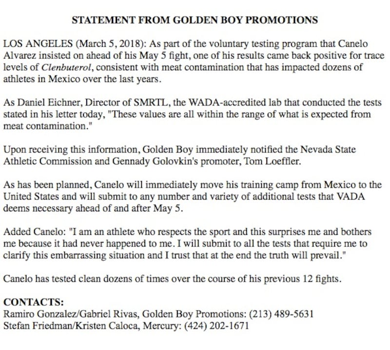 Tras conocer los resultados, la promotora Golden Boy los dio a conocer a la Comisión Atlética del Estado de Nevada y a Tom Loeffler, promotor de Gennady Golovkin.