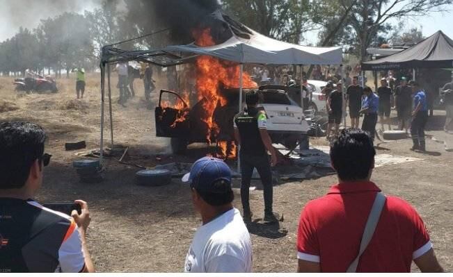 Mientras estaba en revisión el automóvil comenzó a incendiarse y de inmediato las llamas se hicieron grandes rodeando al mismo, pero el buen trabajo del equipo apagó el fuego sin que alguien saliera dañado.