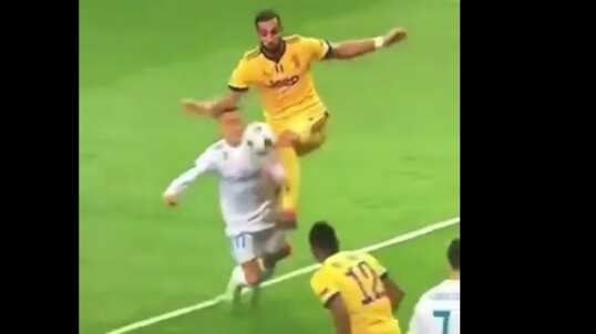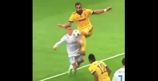 Un servicio por derecha a la llegada del atacante del Madrid, tuvo que ser interrumpida con un empujón por la espalda del defensor de la Juve y además una patada que no deja dudas de que es una infracción.
