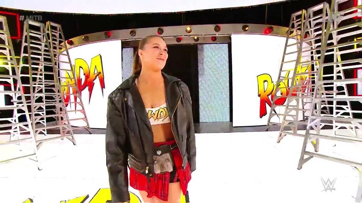 Her name is @RondaRousey, and she was BORN READY to compete as she takes it to the #RAW #WomensChampion @NiaJaxWWE! #MITB #RondavsNia pic.twitter.com/vBVpeLHAde