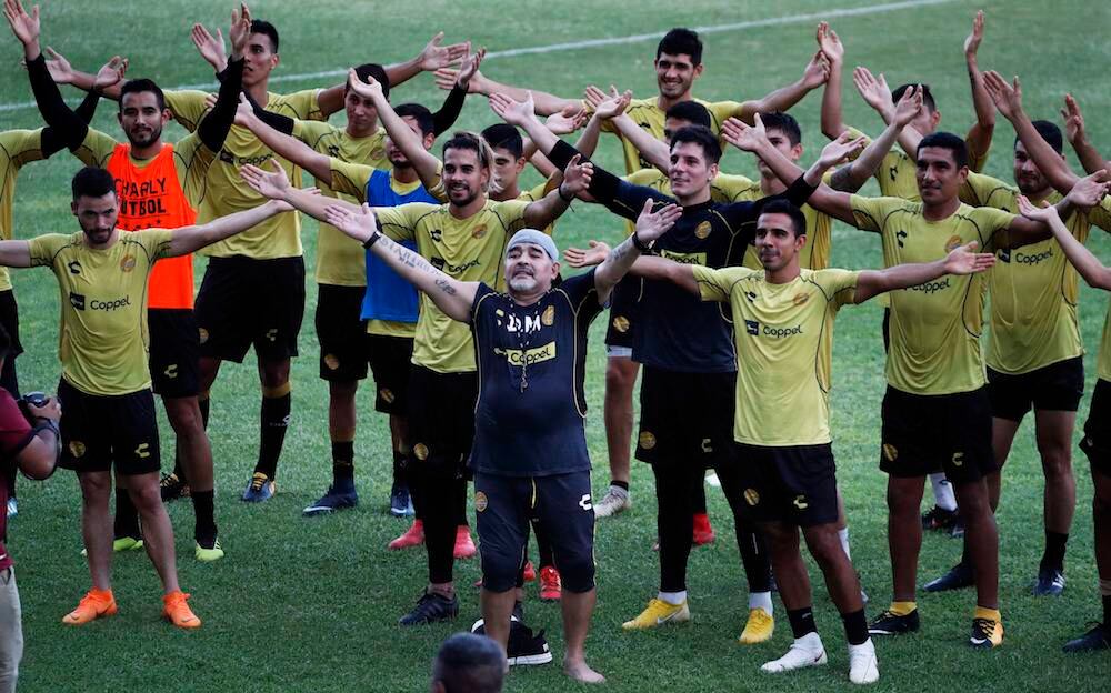 Diego Armando Maradona dirigió su primer entrenamiento con los Dorados de Sinaloa y lo hizo ante cerca de dos mil personas en el Estadio Banorte.