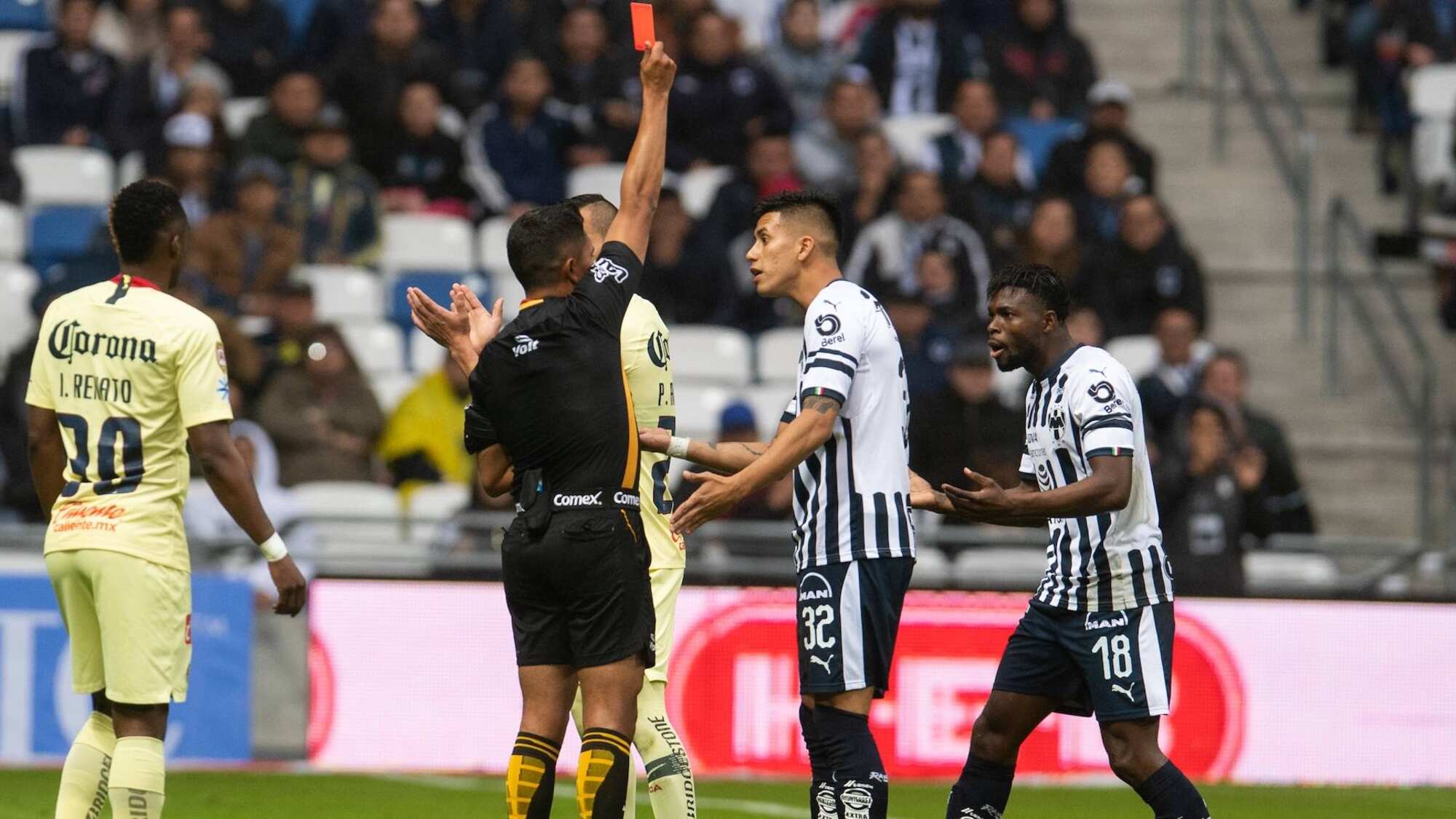Después de la revisión en el VAR, Guerrero le sacó la tarjeta roja al goleador de Rayados porque desde su punto de vista, agredió al portero americanista. Esto generó una serie de desacuerdos en toda la afición y en los jugadores locales.