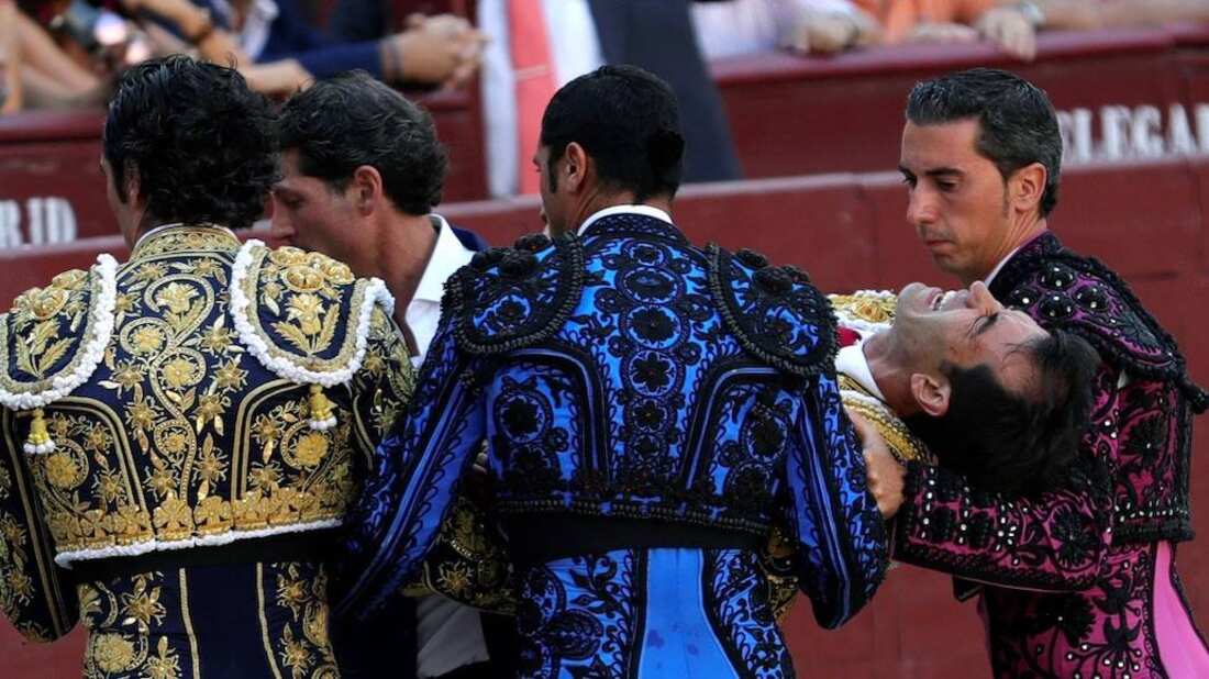 En uno de esos parones el animal hizo por el torero, y fue en la huída hacia las tablas cuando lo prendió por el gemelo, levantándolo e hiriéndole certeramente, pues enseguida fue izado por las cuadrillas para llevarlo a la enfermería mientras brotaba un reguero de sangre, que tiñó de rojo el rosa de la media.