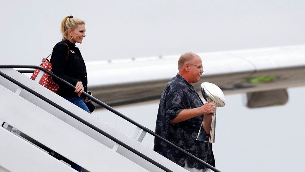 El entrenador Andy Reid, quien portaba el trofeo Vince Lombardi, fue el primero en descender del avión por la tarde, seguido por los jugadores. Los integrantes del equipo abordaron después una caravana de autobuses que los transportó al Arrowhead Stadium.
