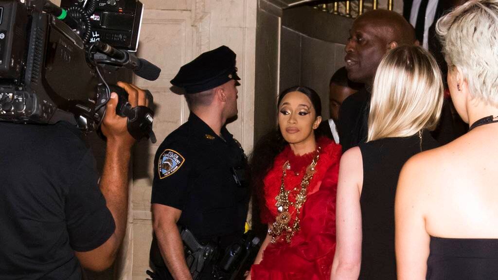 Cardi B, vestida con un voluminoso vestido rojo de Dolce & Gabanna, fue vista saliendo de la fiesta con lo que parecía ser un golpe en la cabeza. Iba descalza.