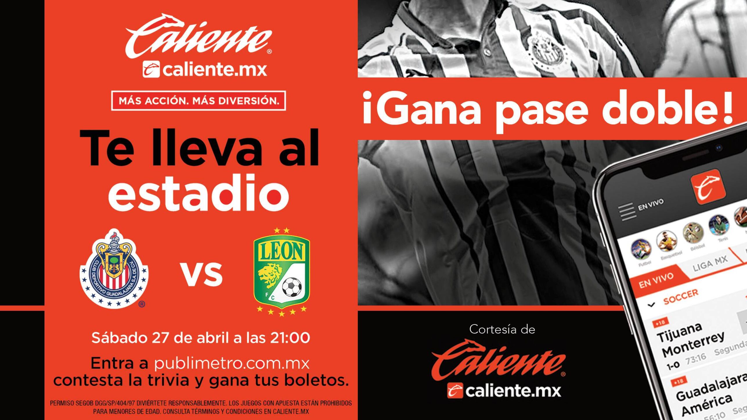 Si eres de las primeras personas en contestar correctamente las siguientes preguntas y mandas tus respuestas junto con tus datos completos (nombre, sección favorita de Publimetro y edad) a ganagdl@publimetro.com.mx podrás ganar un pase doble para asistir al partido que se disputará el próximo 27 de Abril entre “Chivas vs León”.