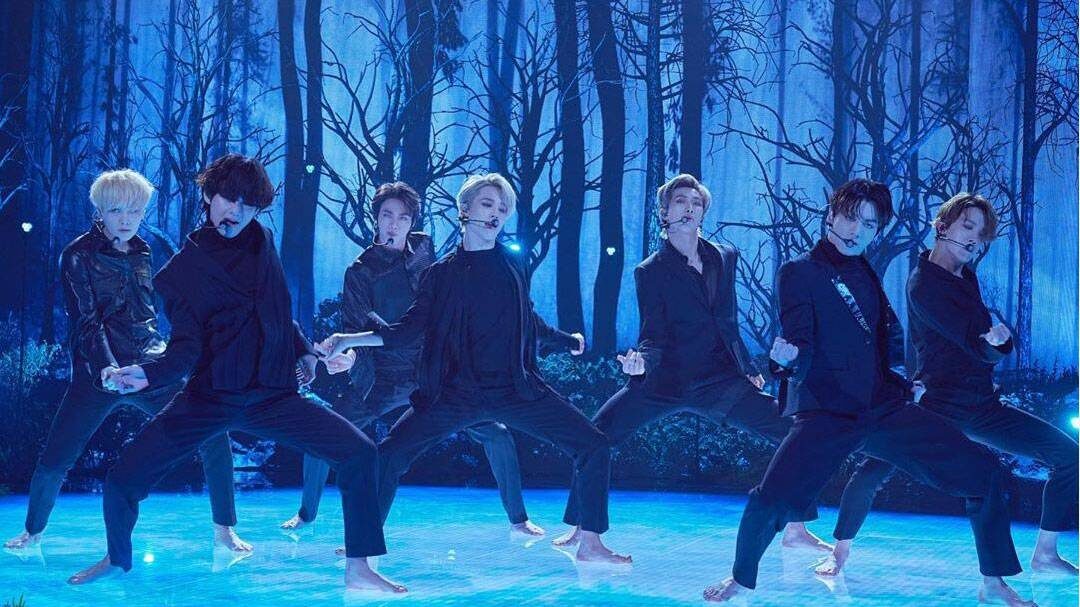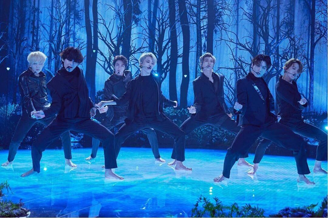 Descalzos y sobre un piso iluminado, los miembros del grupo V, Jin, Jimin, Jungkook, RM, Suga y J-Hope entraron a escena para cantar el nuevo tema con una producción impresionante que representaba un bosque con una cascada.