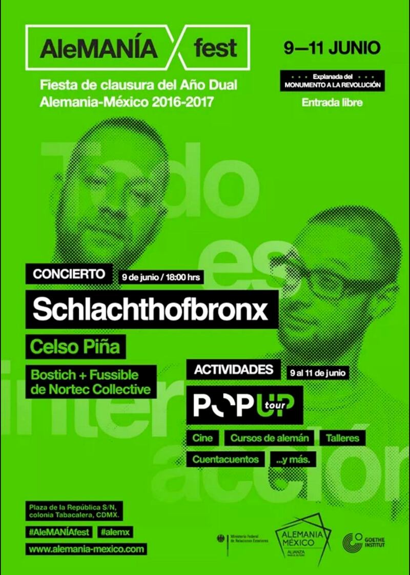El Año Dual Alemania- México llega a su fin y para cerrar con broche de oro se presentará se ofrecerá un concierto gratuito que formará parte del Alemania Fest, donde se podrá disfruta de Schlachthofbronx, además del regiomontano Celso Piña y Bostich + Fusible de Nortec Collective. El Alemania Fest también tendrá otras actividades este fin de semana, donde toda la familia podrá participar con clases de alemán, recorridos virtuales, talleres de química y otras cuantas curiosidades que comenzarán en punto de las 2 de la tarde. Así que ya no tienen pretexto para divertirse este fin de semana si es que les duele el codo o prefieren comenzar a ahorrar para el día del padre.