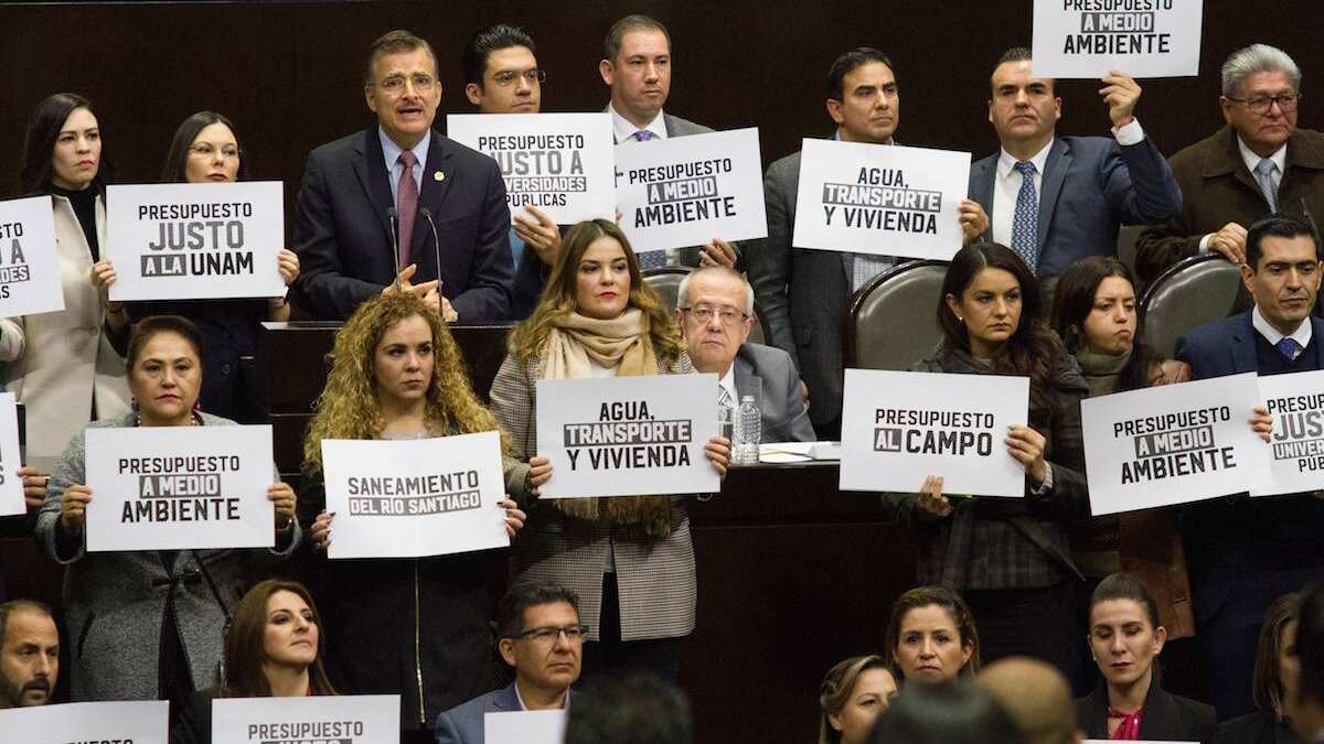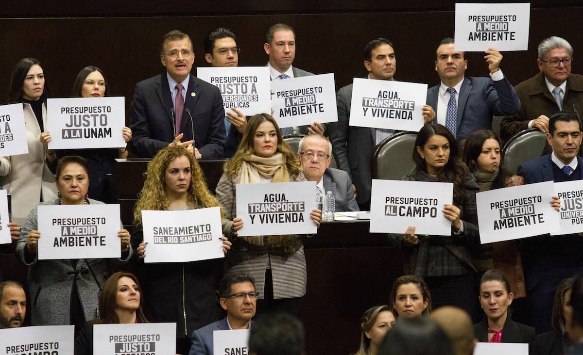 Previo a la comparecencia en la Cámara de Diputados del titular de Hacienda, Carlos Urzúa, los legisladores del PAN, MC, PRI y PRD protestaron con pancartas en contra de la reducción de recursos en áreas estratégicas para el desarrollo del país.