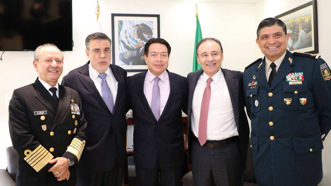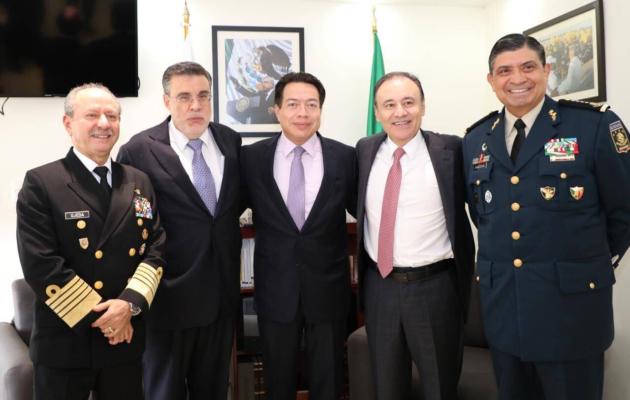 Es un hecho sin precedentes recibir hoy al secretario de Seguridad Pública, al cual le damos la bienvenida; acompañado del secretario de la Defensa Nacional, el general Crescencio Sandoval; al secretario de la Marina, al almirante José Rafael Ojeda; al consejero Jurídico de la Presidencia, licenciado Julio Scherer Ibarra; y al director general del Centro Nacional de Inteligencia, general Audomaro Martínez.
