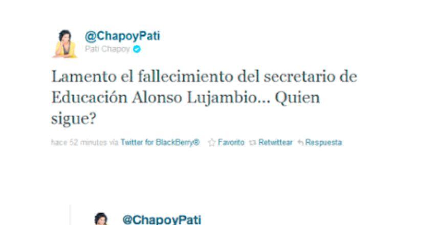 La conductora Paty Chapoy cometío una terrible pifia en su cuenta de Twitter al lamentar el fallecimiento de Alonso Lujambio, actual Secretario de Educación, y no el de Francisco Blake, Secretario de Gobernación.
