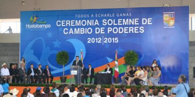 Bajo la figura principal fue colocada la palabra Huatabampo y como eslogan aparece la frase: “Todos a echarle ganas”, con la identificación en mayúsculas de la que será su administración “Gobierno municipal 2012-2015”.