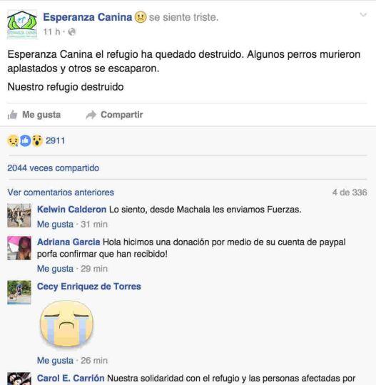 En la página de Facebook de Esperanza Canina, ellos mismos anunciaron la terrible noticia: muchos perros habían fallecido al ser aplastados por los escombros y otros tantos huyeron, siendo casi imposible recuperarlos ya que la ciudad se encontraba sin luz y en medio de un completo caos.