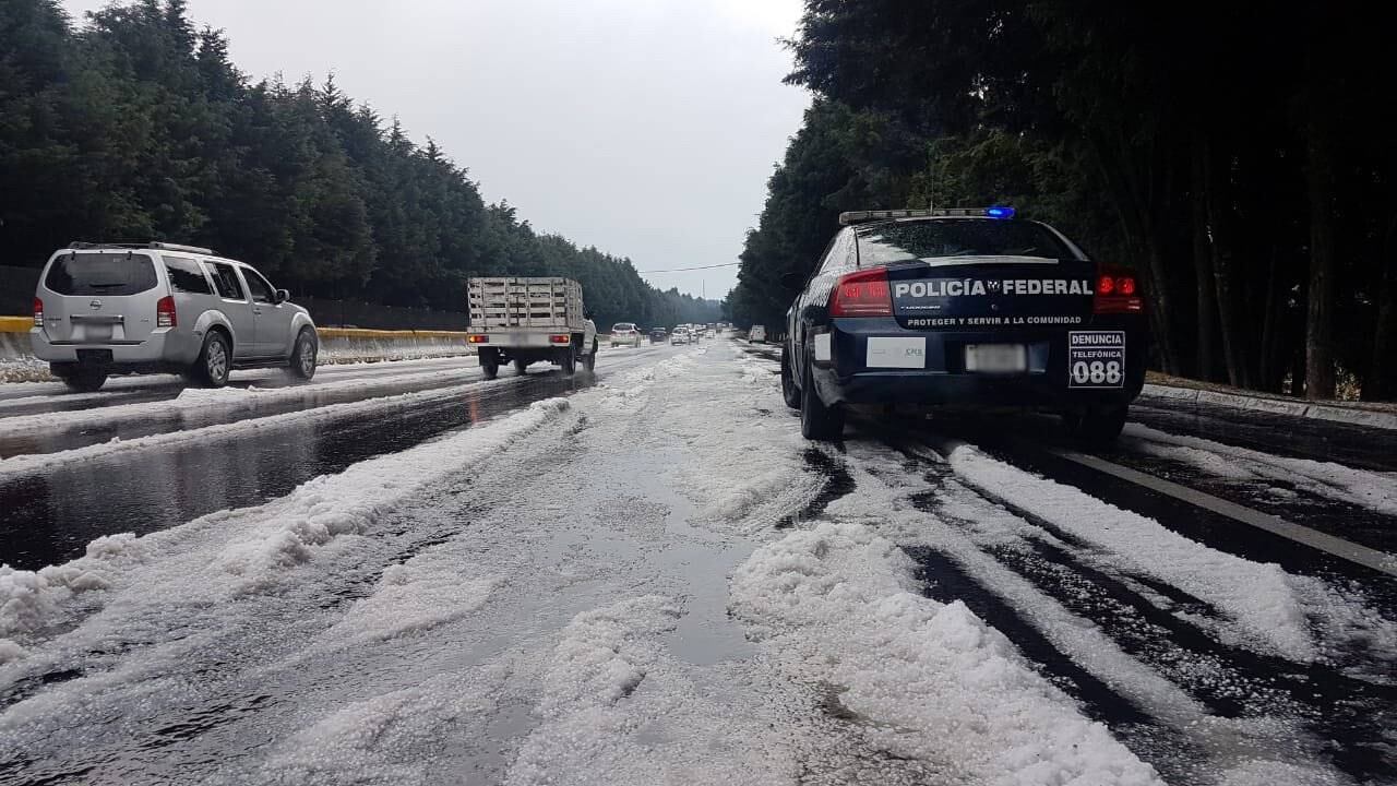 La tarde de este viernes se presentó caída de granizo en la colonia Pueblo de Parres de la delegación Tlalpan, y en la Carretera México-Cuernavaca del kilómetro 38 hasta el 40.