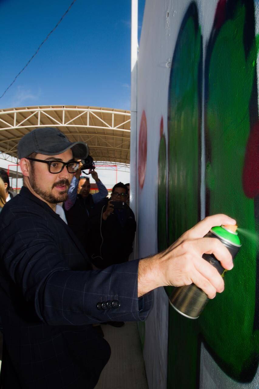 En su gira de trabajo por el estado de Sonora, el titular de la Secretaría de Desarrollo Agrario, Territorial y Urbano (Sedatu), Román Meyer Falcón, convivió con jóvenes ‘grafiteros’ y aceptó la invitación de pintar una barda con aerosol.