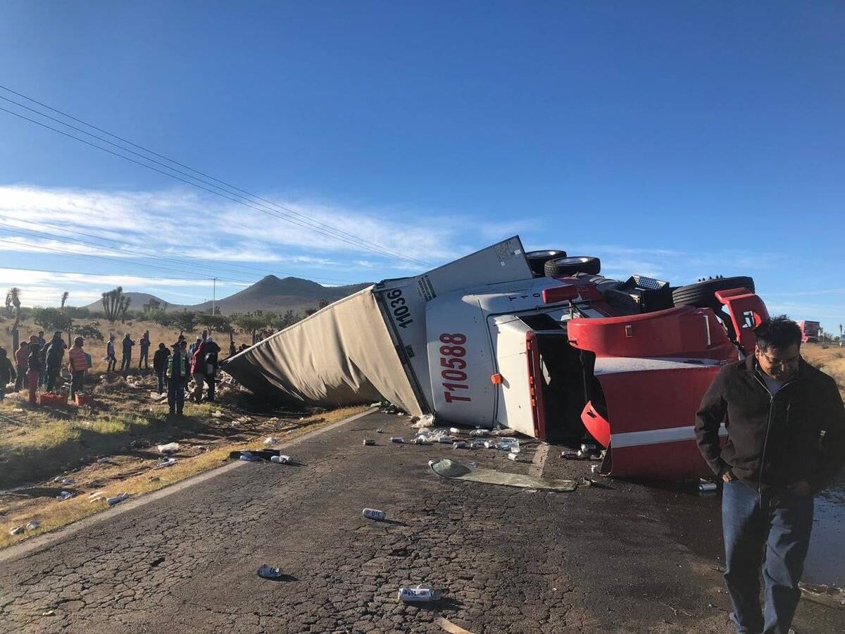 De nueva cuenta en Zacatecas se registró un acto de rapiña, luego que volcara un tractocamión con doble remolque cargado de cerveza sobre la carretera federal 45, a la altura de la comunidad San José de Lourdes, en el municipio de Fresnillo.
