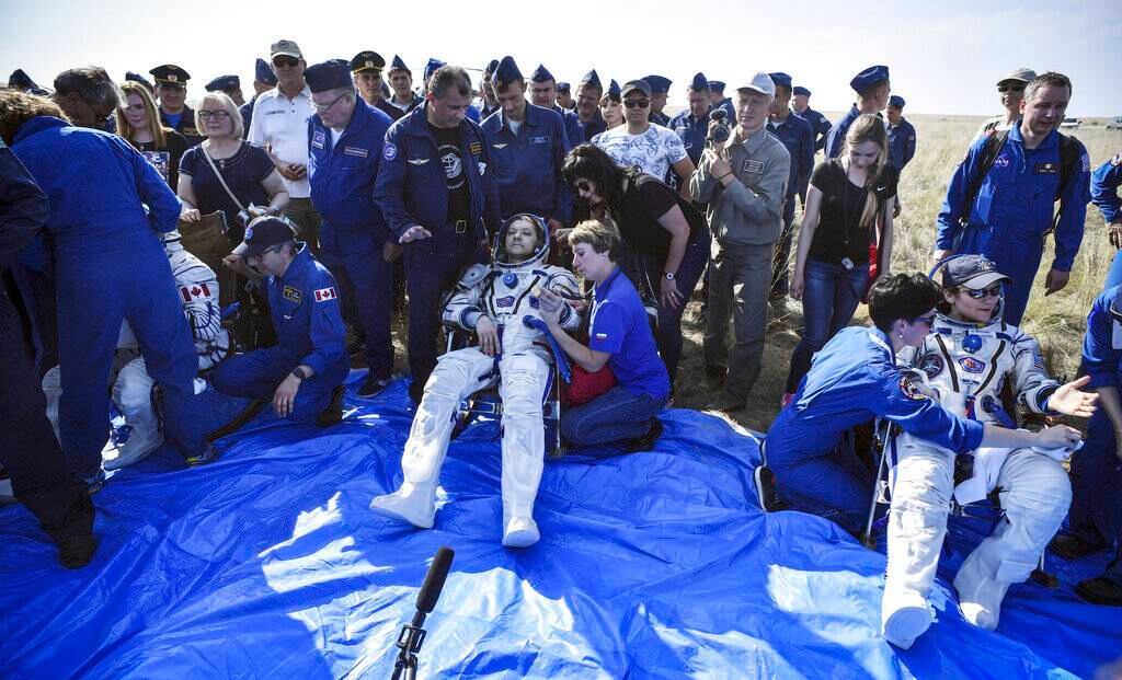 La cápsula Soyuz con los astronautas de Canadá, Rusia y Estados Unidos aterrizó en las estepas de Kazajistán a las 8:47 de la mañana (hora local), menos de un minuto antes de la hora programada, después de un viaje de tres horas y media desde el laboratorio en órbita.