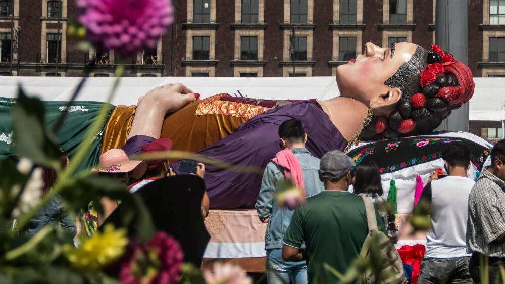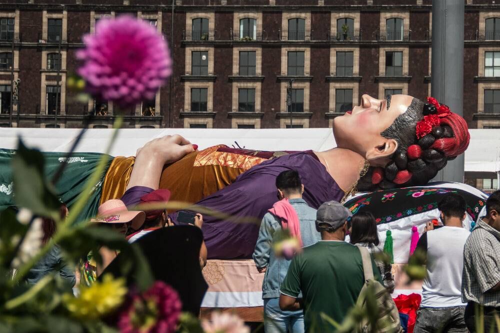 Con motivo del 112 aniversario del natalicio de la pintora Frida Kahlo, en el Zócalo de la Ciudad de México se montó la exposición ‘Los colores de Frida’, en la muestra participan artistas nacionales e internacionales, también se contó con la participación de los productores de flores de Xochimilco y del mercado de Jamaica.