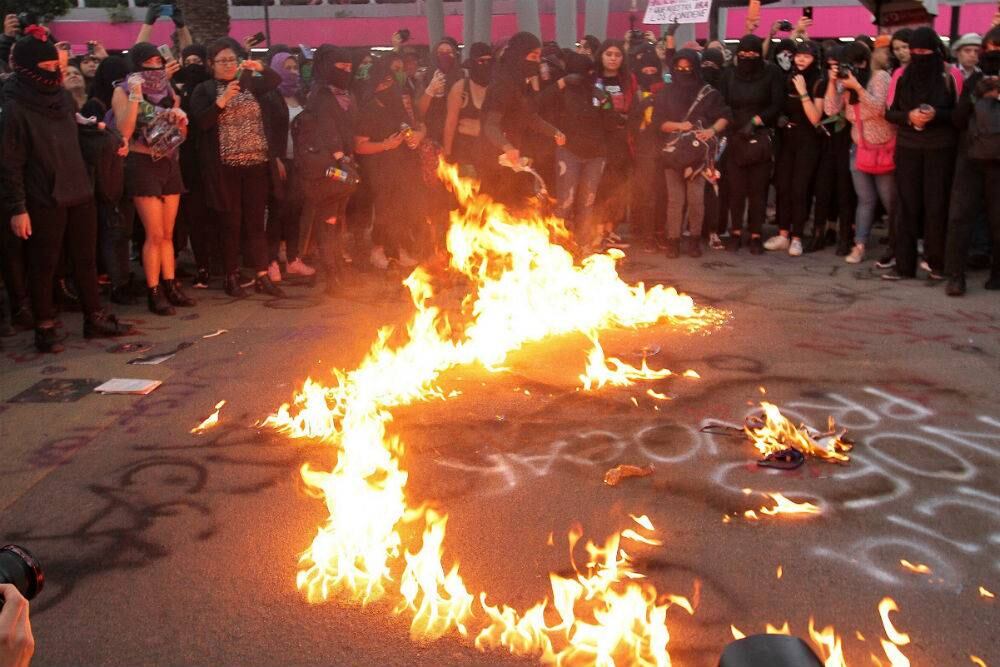 Embozadas, con cubrebocas y máscaras, rompieron cristales con palos, tiraron anuncios y utilizaron extintores para generar destrozos, afectando el mobiliario del andén en la Glorieta de los Insurgentes.