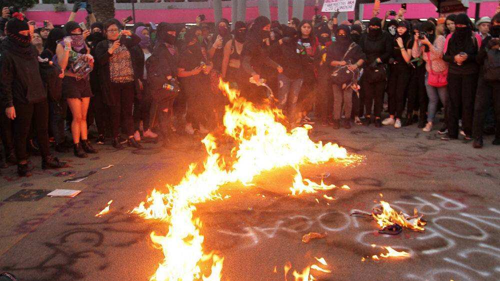 Las activistas, entre gritos, realizaron pintas y golpearon lo que encontraban a su paso, mientras más mujeres en la Glorieta de Insurgentes se manifiestaban contra la violencia hacia mujeres lanzando brillatina de diversos colores.