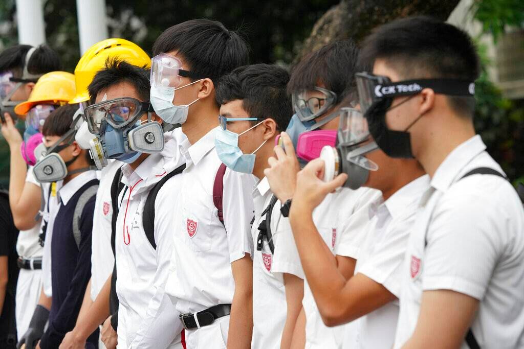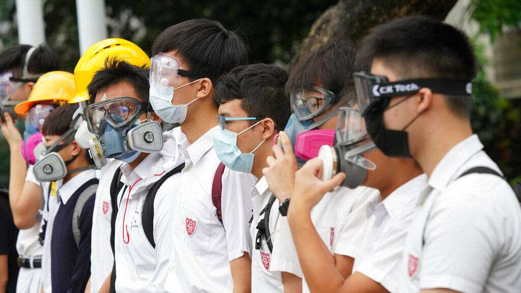 En el primer día del curso el lunes, los estudiantes de secundaria en Hong Kong complementaron sus formales uniformes blancos con máscaras de gas, gafas protectoras y cascos, en una jornada de huelgas que pretendía mostrar el compromiso con el combativo movimiento de protestas contra el gobierno.
