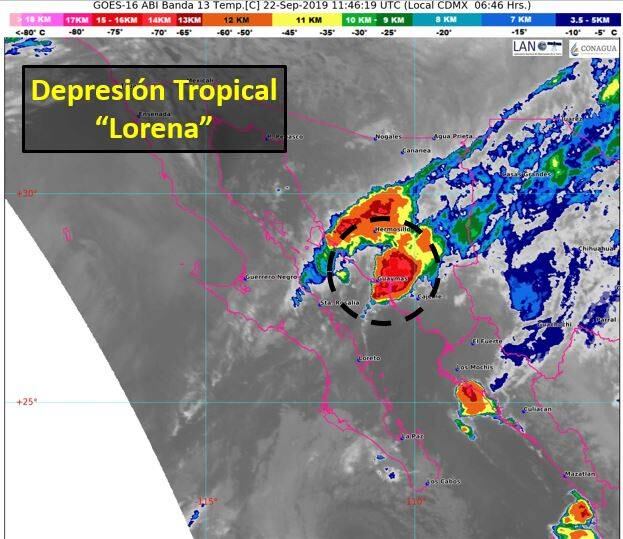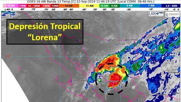 Tras haber tocado tierra durante la madrugada, la depresión tropical Lorena se localiza esta mañana a 33 kilómetros al este de Bahía Kino, Sonora, y se desplaza hacia el norte, causando vientos y lluvias torrenciales en este estado e intensas en Baja California Sur, Chihuahua y norte de Sinaloa.