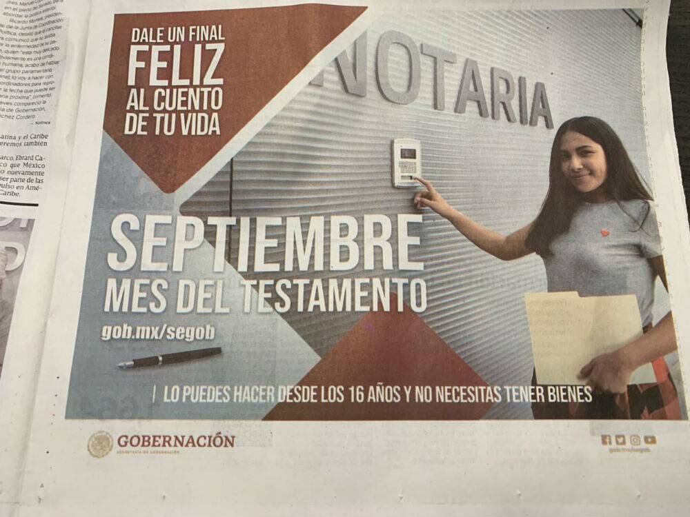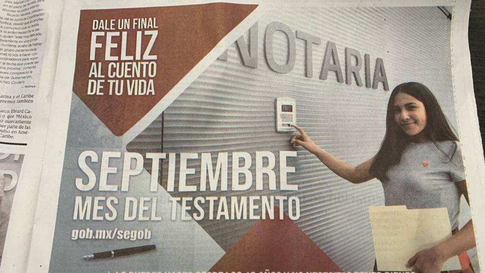 Sin embargo, parece que el gobierno federal alargó este beneficio en algunos medios de comunicación, pues septiembre concluyó hace dos días y aún así salieron anuncios sobre el Mes del Testamento en varios medios impresos.