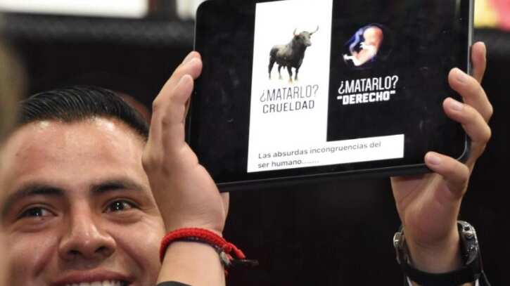 Mayorga presentó en el Congreso local, durante la participación de la legisladora Arely Rubí Miranda sobre el tema, una imagen en donde señaló que matar a un toro se considera una crueldad, pero matar a un feto un derecho.
