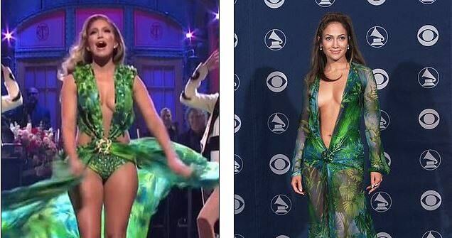 En febrero del 2011, Jlo realizó su monólogo de SNL con una bata de baño azul claro. Al final de su discurso, «la diva del Bronx» se lo quitó, revelando el vestido verde que se hundía debajo. La multitud, por supuesto, se volvió loca, ya que solo había pasado un año desde su revelación de los Grammys.
