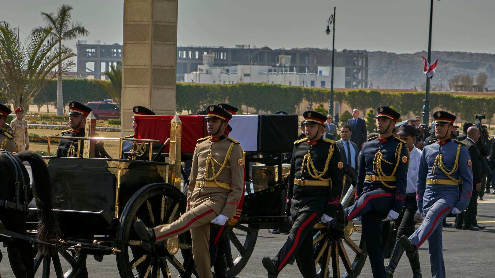 Miembros de la Guardia Republicana cargaron el ataúd envuelto en la bandera egipcia.