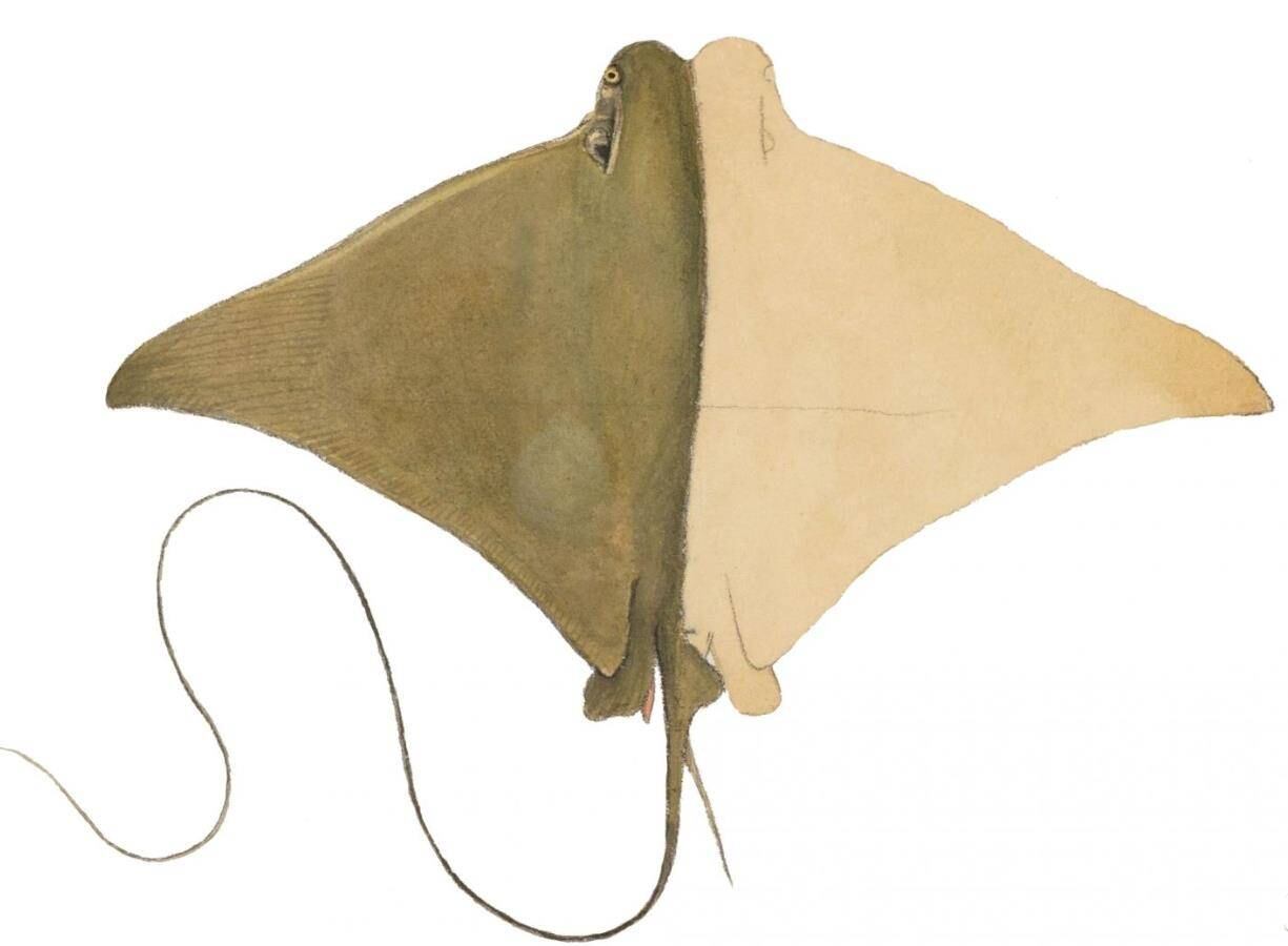 Una especie de raya: la rayo con nariz de vaca brasileña, Rhinoptera brasiliensis, y el pez rey del Golfo, Menticirrhus littoralis, han aparecido cuando el clima se calienta en la ensenada Barnegat de Nueva Jersey, a unas dos horas en coche al sur de la ciudad de Nueva York.