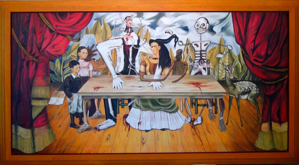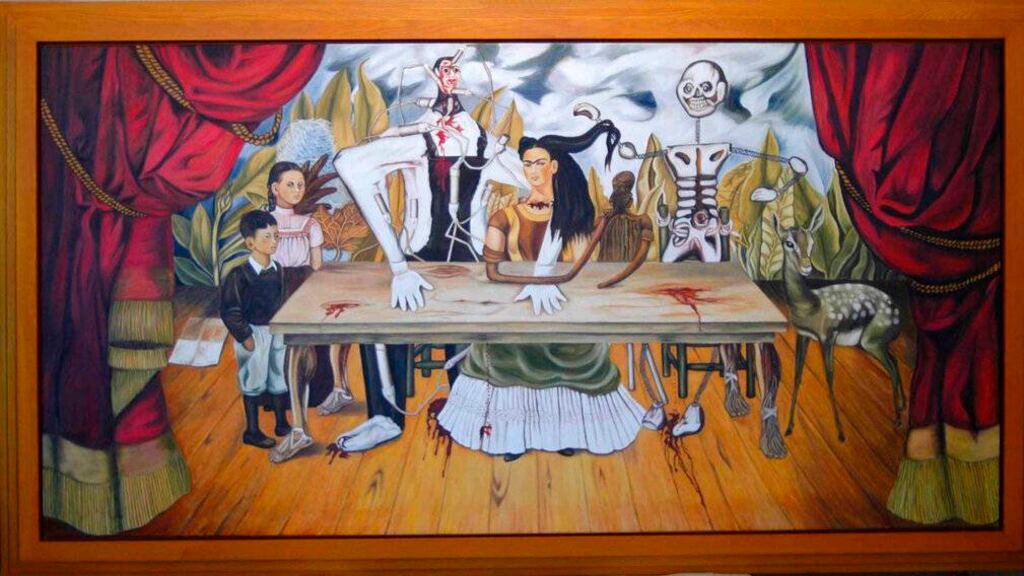 Presentado en 1940 durante la Exposición Internacional de Surrealismo de la Galería de Arte Mexicano, el cuadro incluye un autorretrato de Kahlo al centro de una mesa, flanqueada por un Judas de Semana Santa y un monstruo, quizás la Muerte, que la abraza y retiene. En el extremo izquierdo de la mesa, que sangra por los nudos de la madera y que según los expertos representa el alma torturada de la artista, se hallan dos sobrinos de Kahlo, hijos de su hermana Cristina, y a la derecha el cervatillo Granizo, su mascota. Toda la escena queda enmarcada, a modo de teatro, por las cortinas de un gran telón.