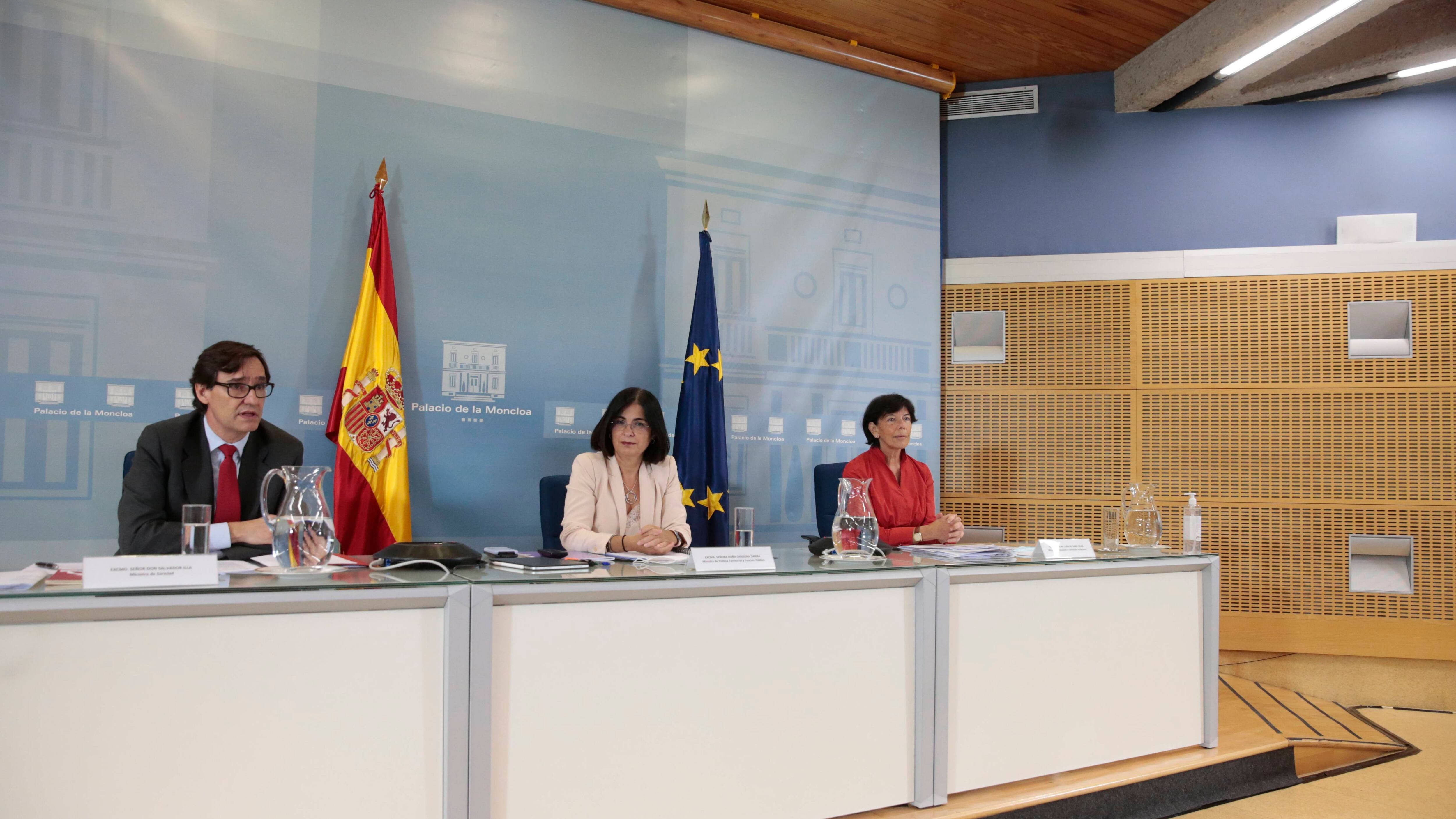 Darias ha comparecido en rueda de prensa junto a los ministros de Sanidad, Salvador Illa, y de Educación y Formación Profesional, Isabel Celaá, tras la conferencia multisectorial de Educación y Sanidad reunida en el Palacio de la Moncloa.