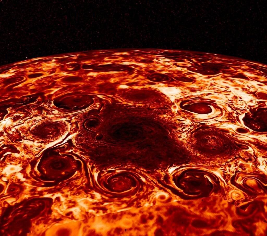 Después de que la sonda Juno de la NASA entrara en órbita alrededor de Júpiter en 2016, la nave descubrió ciclones gigantes dispuestos en patrones geométricos alrededor de los polos del mundo. En el polo norte del planeta, hay ocho vórtices que rodean un vórtice central, y en el polo sur hay seis.