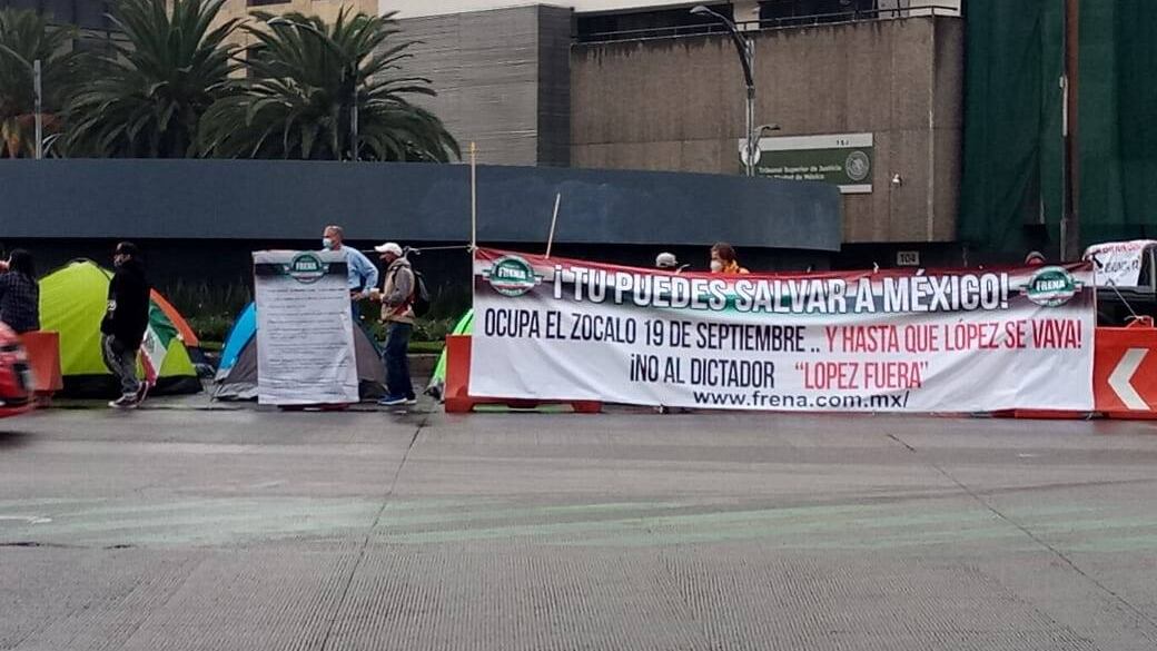 Dos días después de haberse instalado a lo largo de avenida Juárez, el Frente Nacional Anti AMLO, (FRENA) mantiene su plantón en señal de protesta en contra del presidente López Obrador, a pesar de las condiciones climáticas.