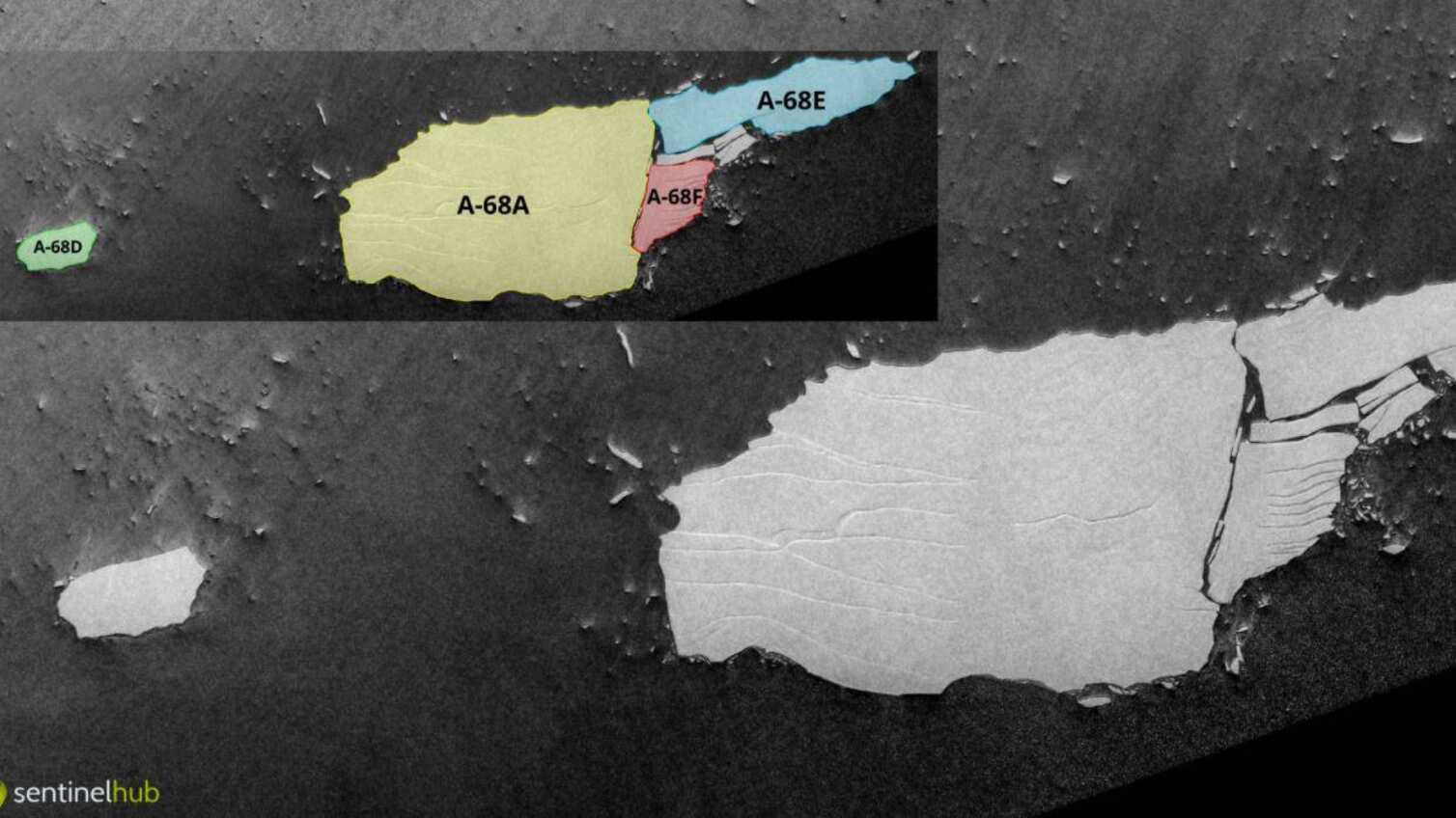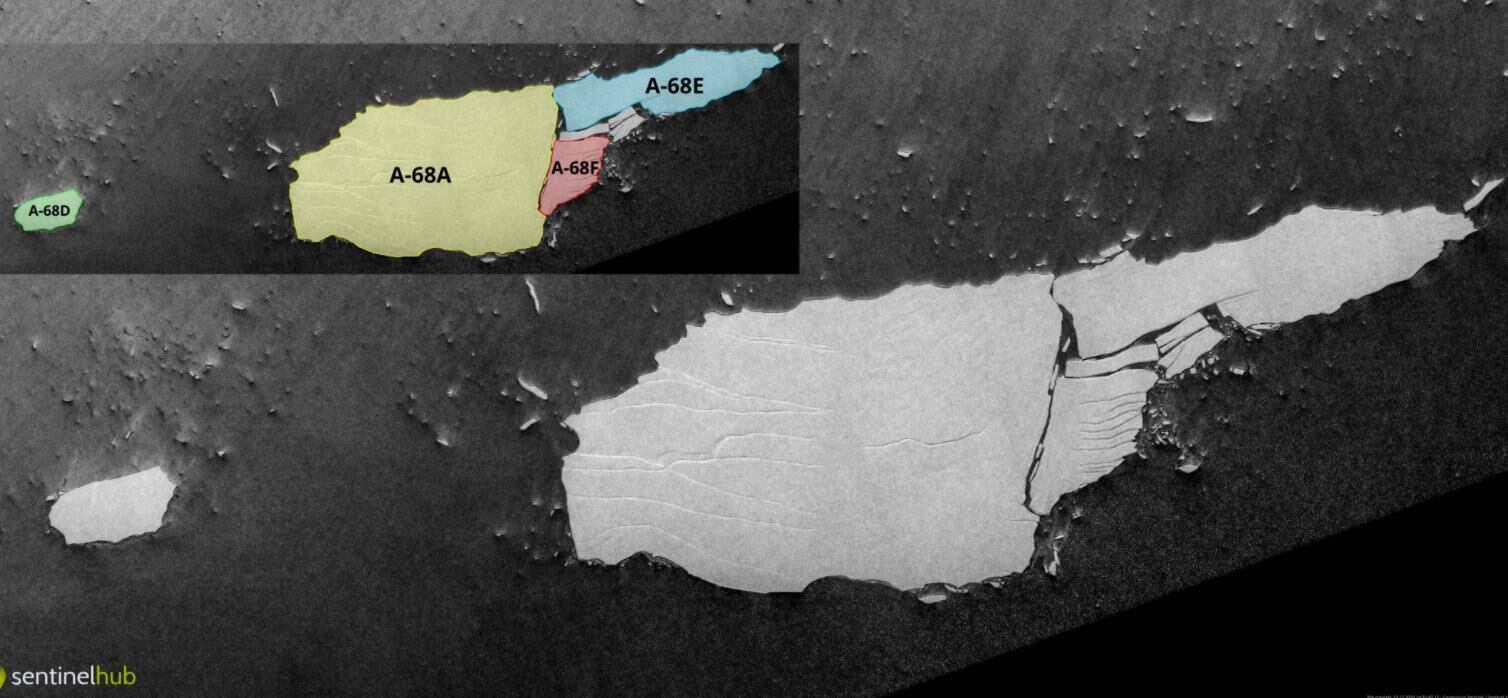 Las últimas imágenes revelan que el iceberg A-68A, uno de los más grandes de todos los tiempos, se ha roto en varios pedazos, con dos grandes fragmentos de hielo desprendiéndose del iceberg principal y flotando en mar abierto en el Atlántico Sur.