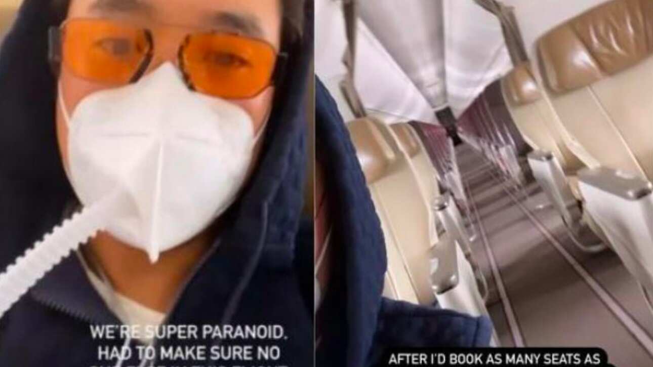 Fue a través de sus historias de instagram en donde el empresario compartió historias en las que se mostró a bordo del vuelo totalmente y aseguró que tanto él como su esposa están ‘totalmente paranoicos por la situación actual del Covid-19”.