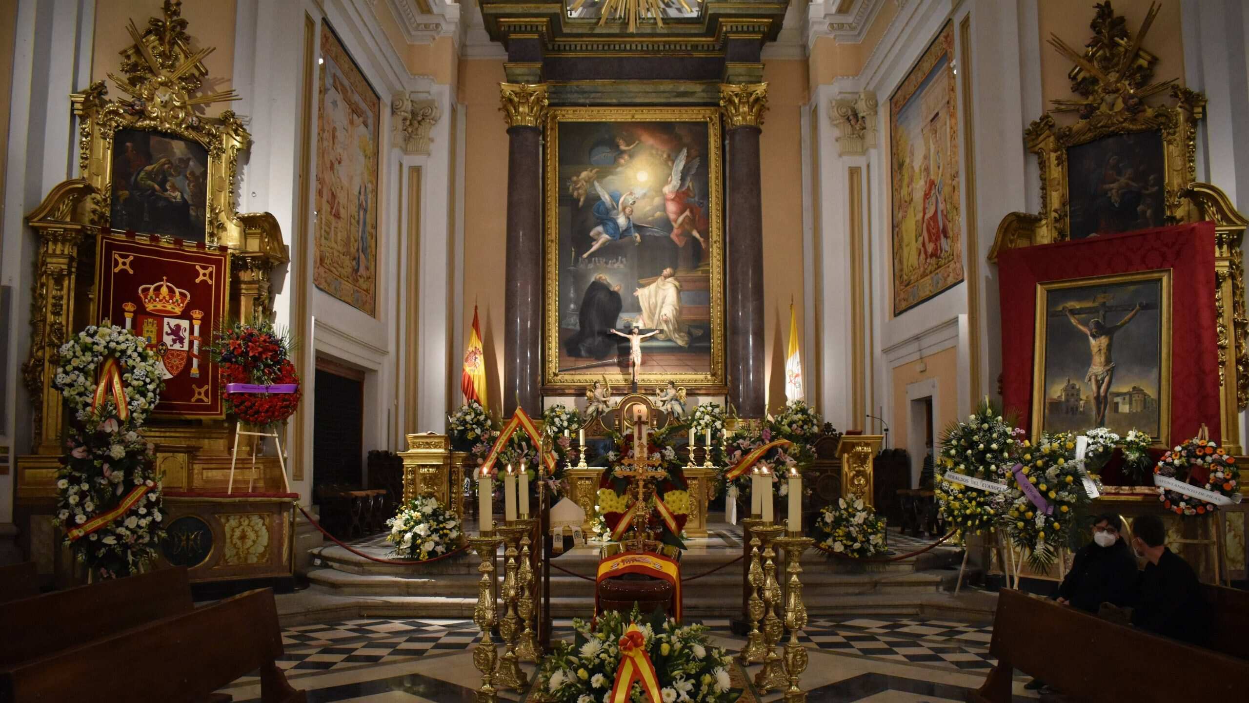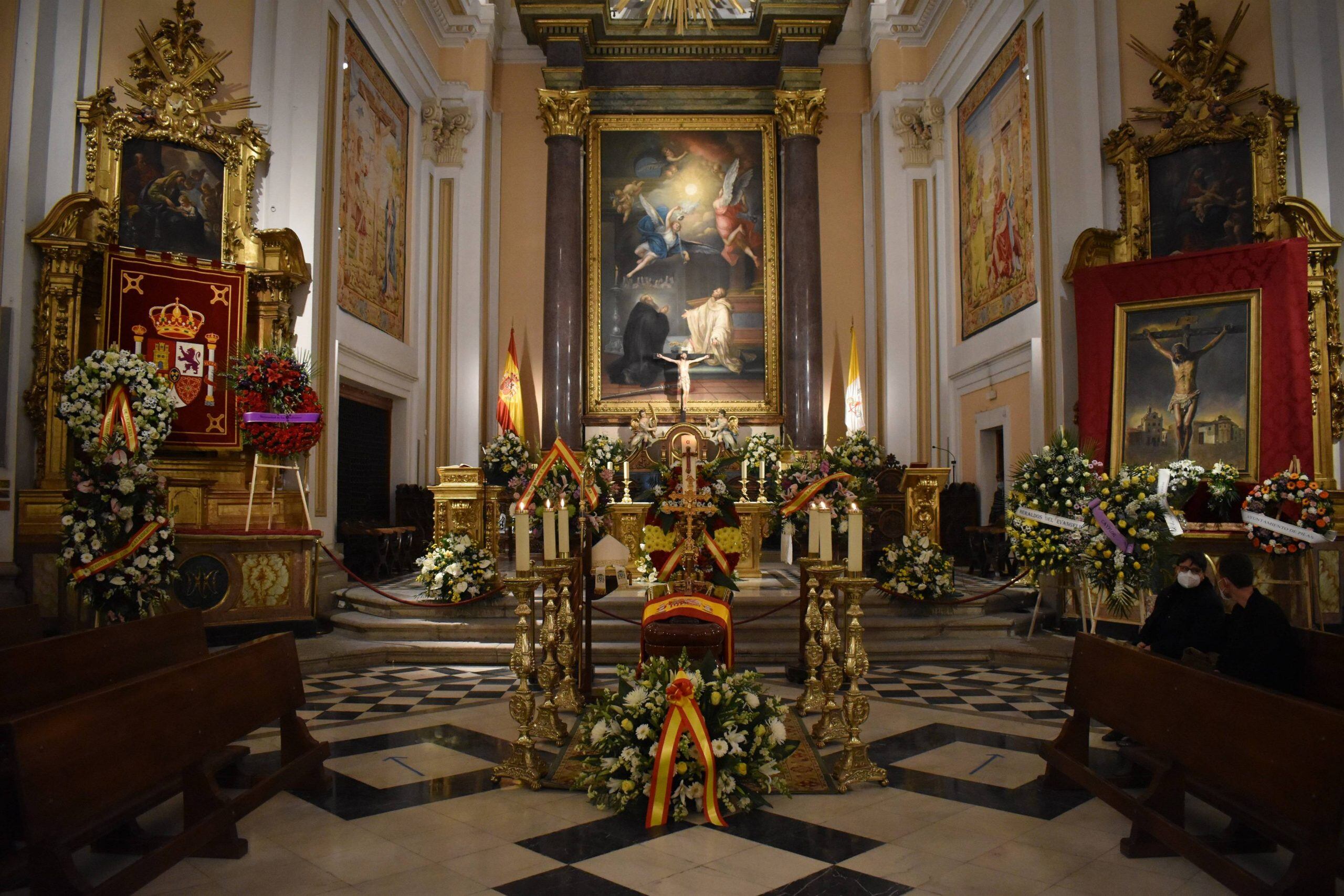 El féretro con el cuerpo de Juan del Río ha permanecido expuesto a lo largo de todo este viernes en el templo, cubierto por una bandera de España y rodeado de múltiples coronas de flores.