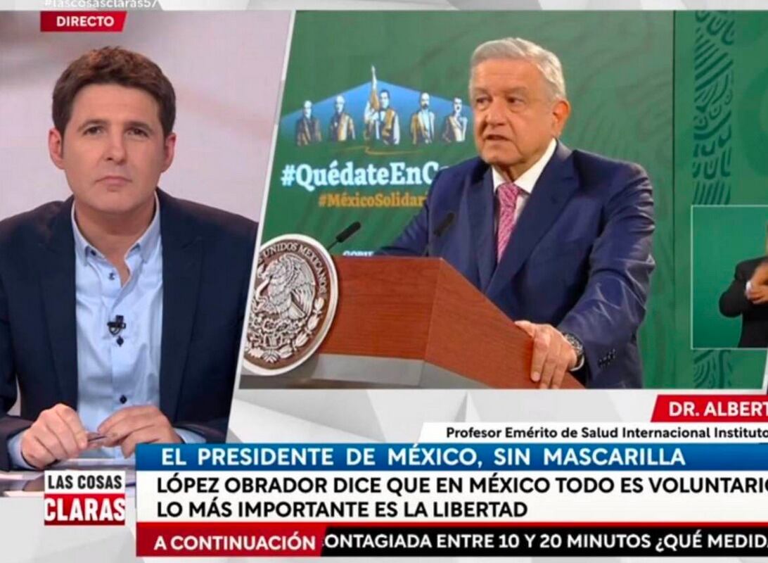En el programa español retomaron para tema de debate las declaraciones de AMLO de este lunes en el que con un contundente ‘no’, AMLO niega que vaya a usar cubrebocas debido a que según explicó ‘ya no es capaz de contagiar’, declaración que generó la molestia de los presentadores del programa ‘Las Cosas Claras en la cadena RTVE, en especial del ya mencionado periodista y conductor Jesús Cintora.
