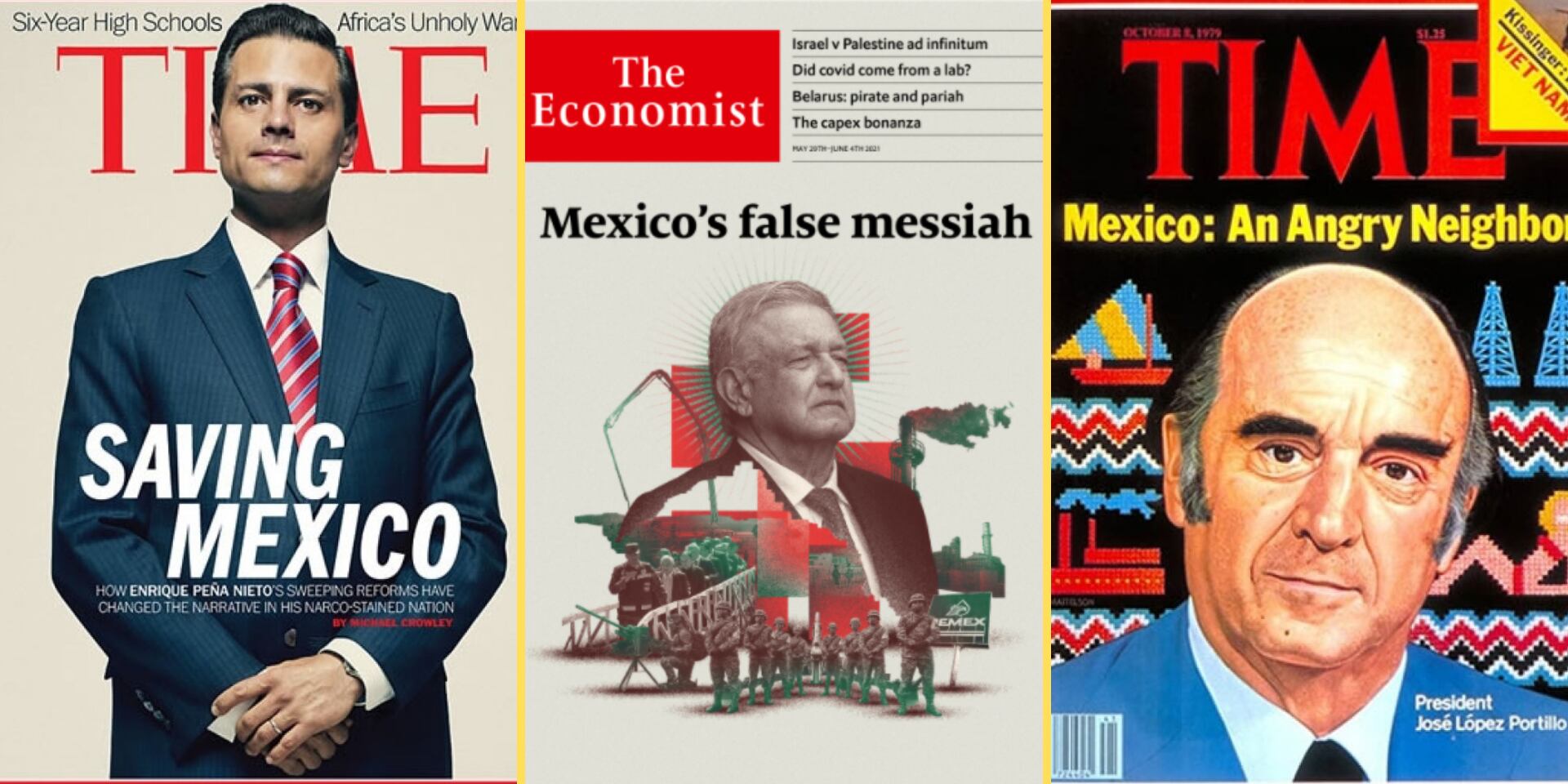 Otra portada reconocida -y que resurgió en redes sociales- fue Saving Mexico, de la revista Time, que en 2014 destacó las reformas estructurales impulsadas por el presidente Enrique Peña Nieto. La portada fue ampliamente criticada en su momento, incluso por el entonces líder opositor, López Obrador.